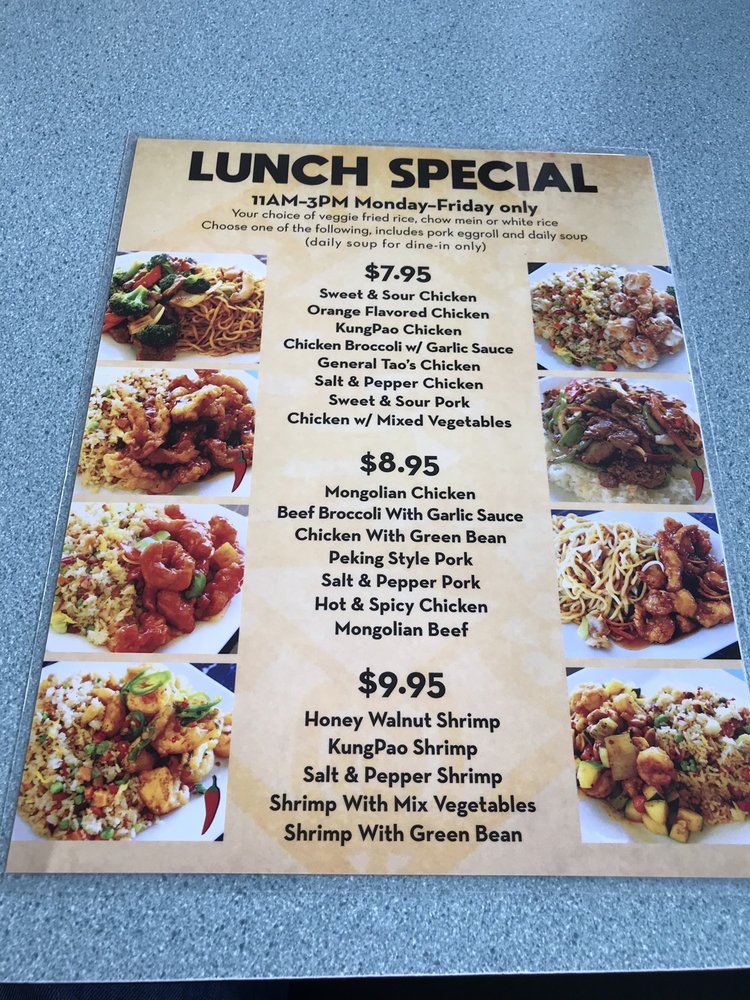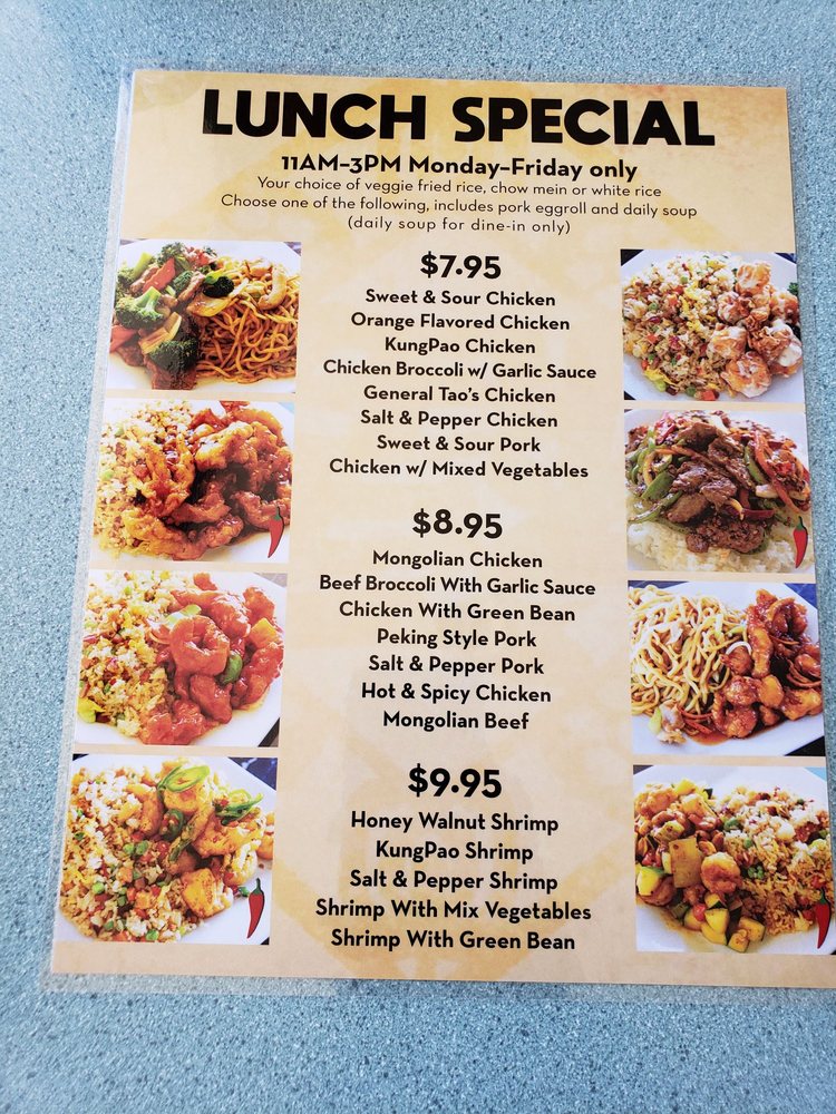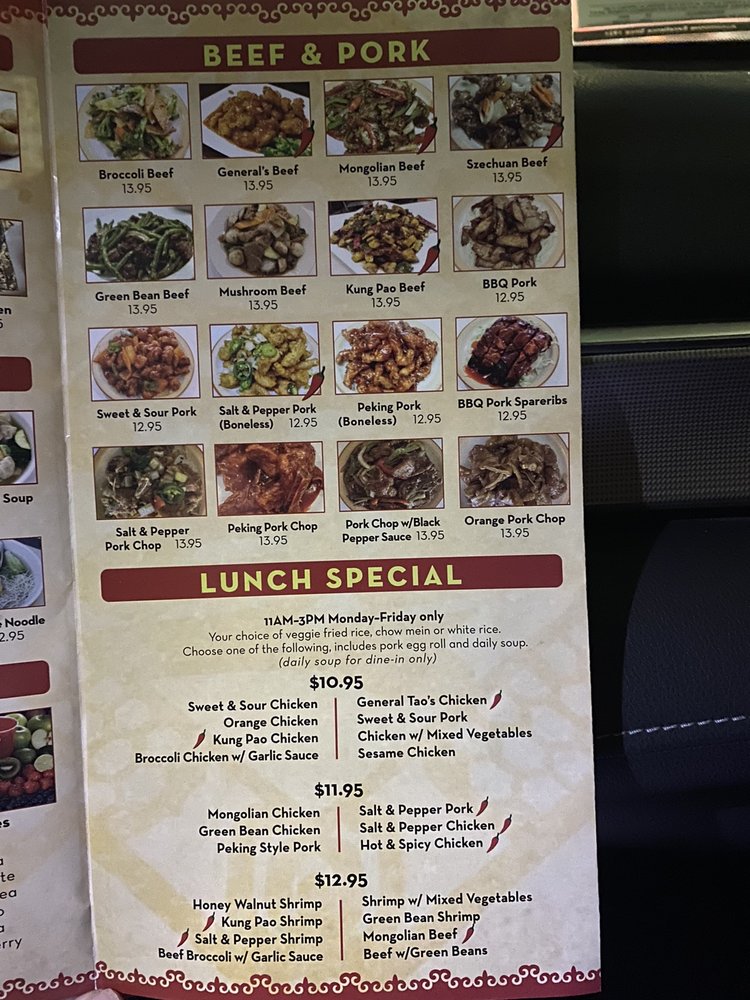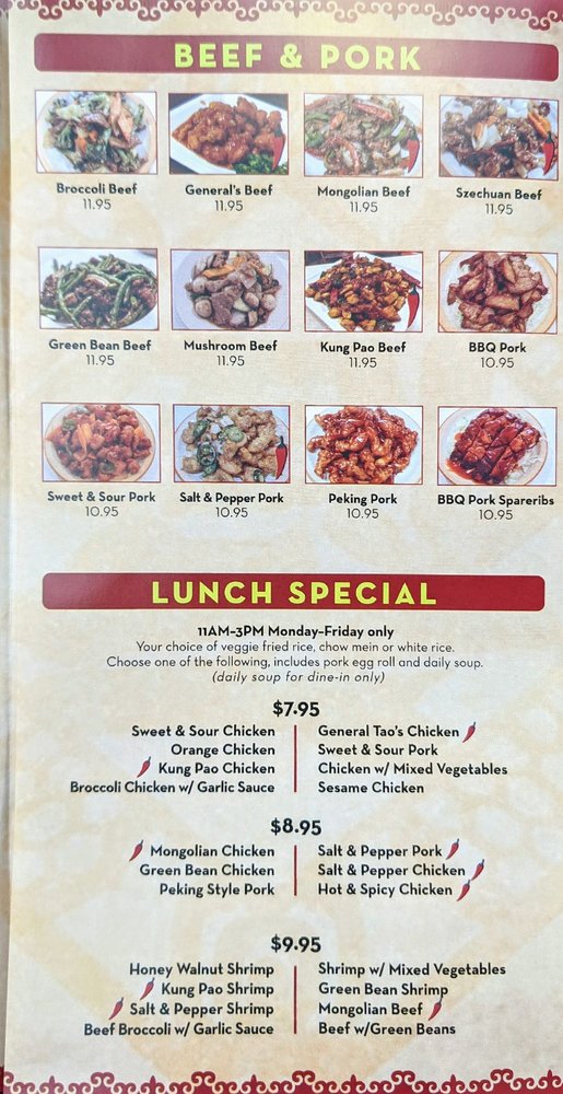 Your choice of veggie fried rice, chow mein or white rice. Choose one of the following includes pork and egg roll.